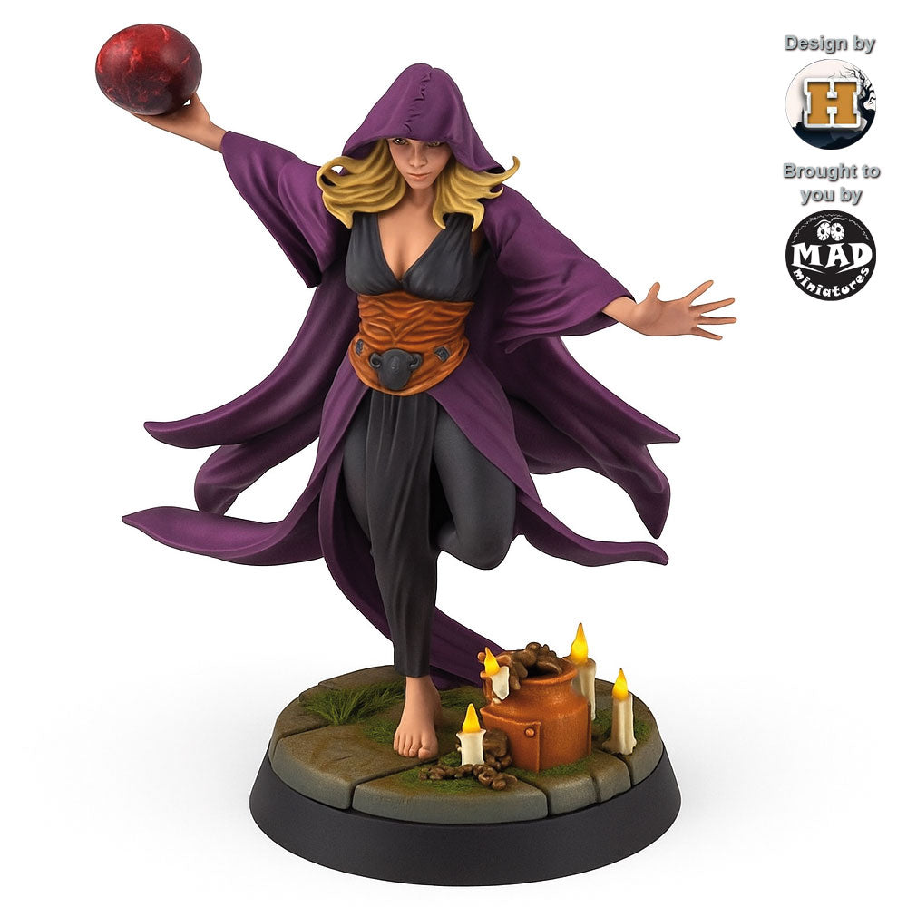 This variant of Belith features an additional layer on her flowing cape, adding an extra touch of elegance and mystique to her already striking presence. She still walks barefoot, grounding herself with the earth’s energy, and wears her signature robe adorned with subtle magical patterns. Her ornate, mystical belt—more like a ceremonial sash—symbolizes her mastery over the elements. In her hands, she wields a shimmering crystal ball, radiating an aura of untapped potential and foresight.