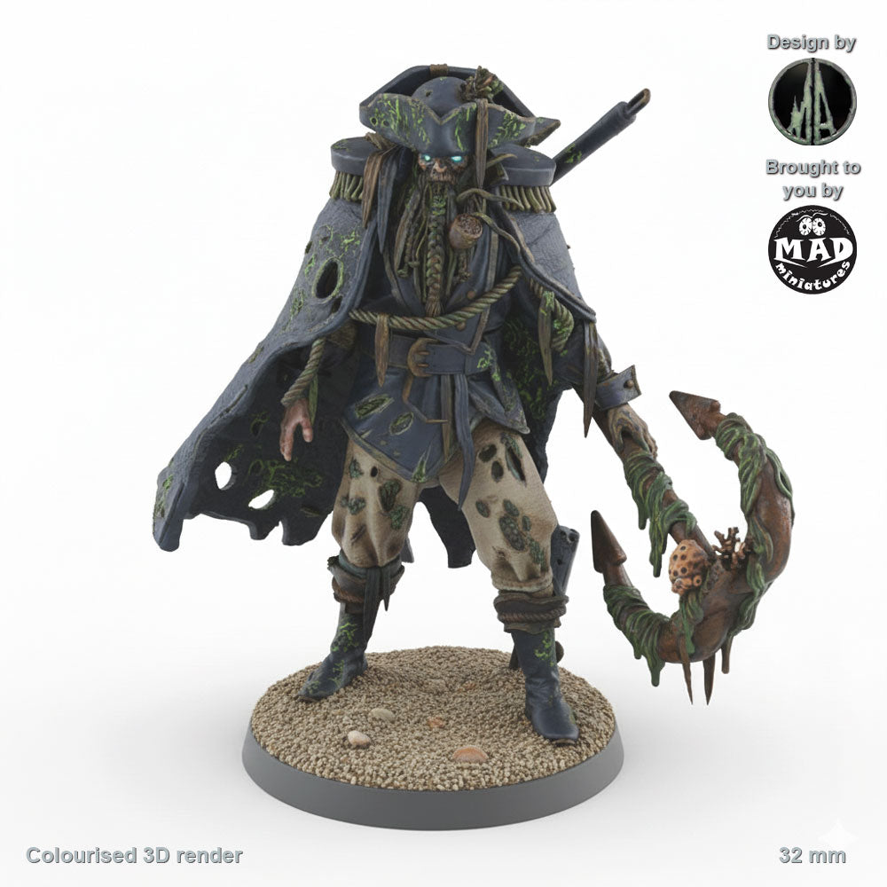 The captain, wielding his massive anchor like a weapon of judgment, leads his ship through the cursed waters, bound neither to life nor death. His tattered coat and barnacle-encrusted hat speak of centuries lost beneath the waves, while his glowing, lifeless eyes betray the heavy burden of his sins. Driven by a relentless thirst for redemption or revenge, the Cursed Captain is both a tragic figure and a harbinger of doom.