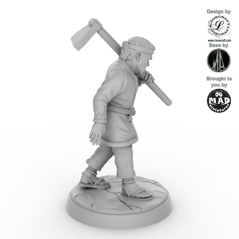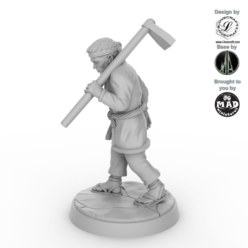 This field worker was designed by Iain Lovecraft and made by Mad Miniatures. He comes unpainted and with a separate base as shown in the grey renders. The base was designed by Monolith Arts.