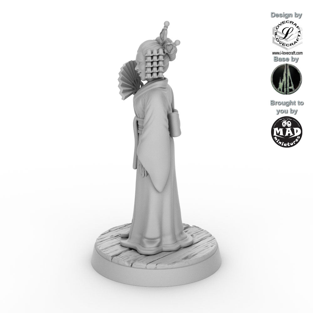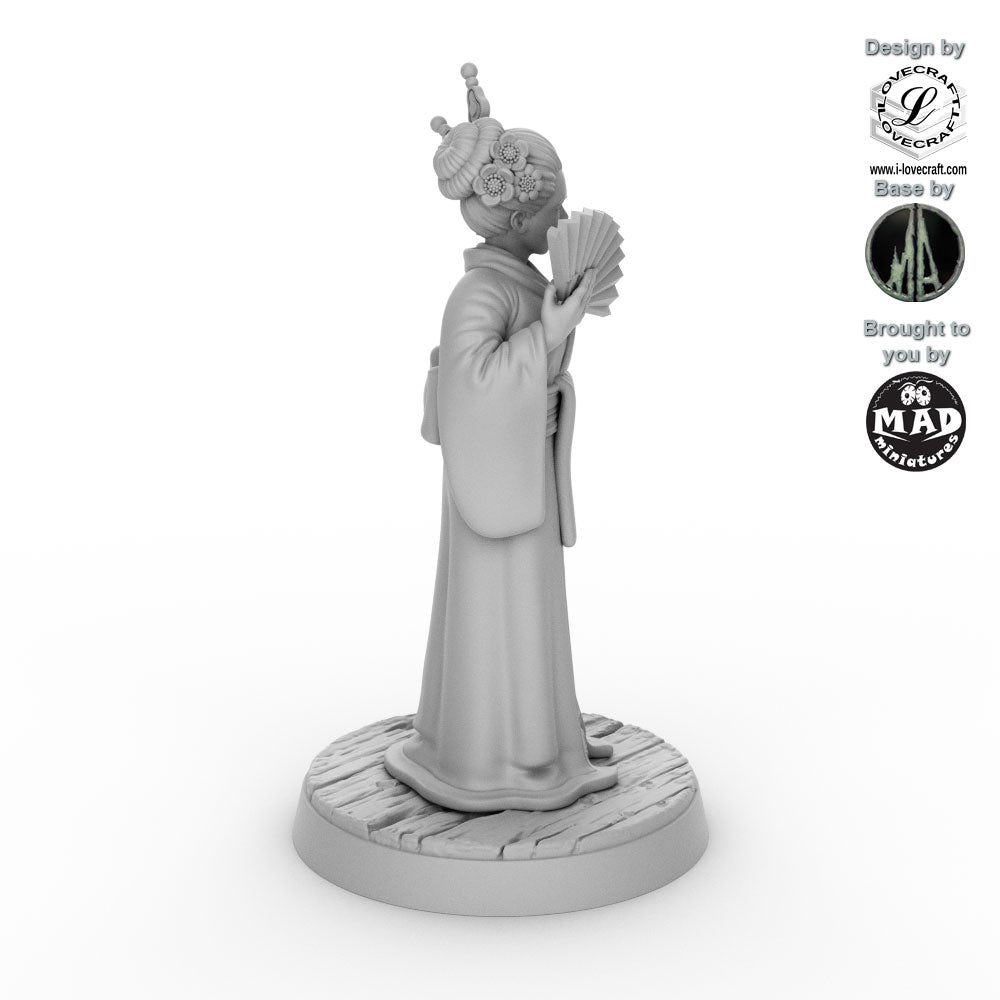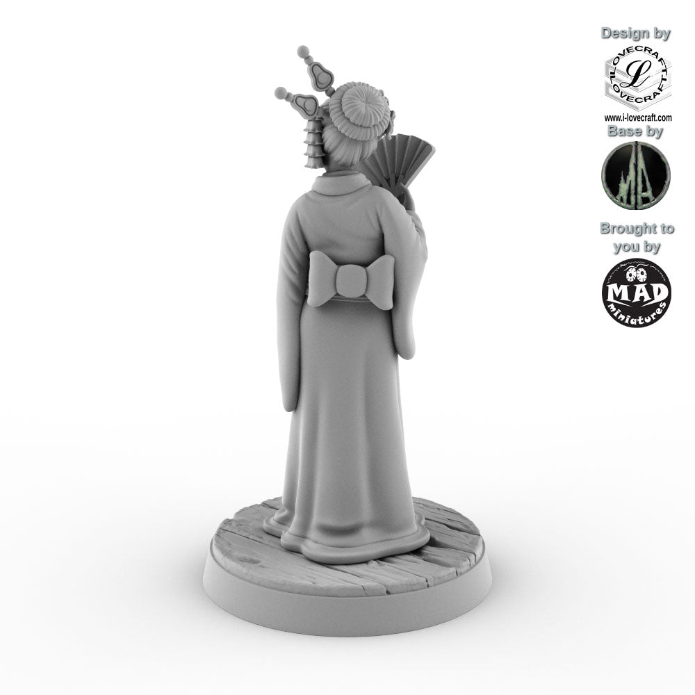 This Geisha was designed by Iain Lovecraft and made by Mad Miniatures. She comes unpainted and with a separate base as shown in the grey renders. The base was designed by Monolith Arts.
