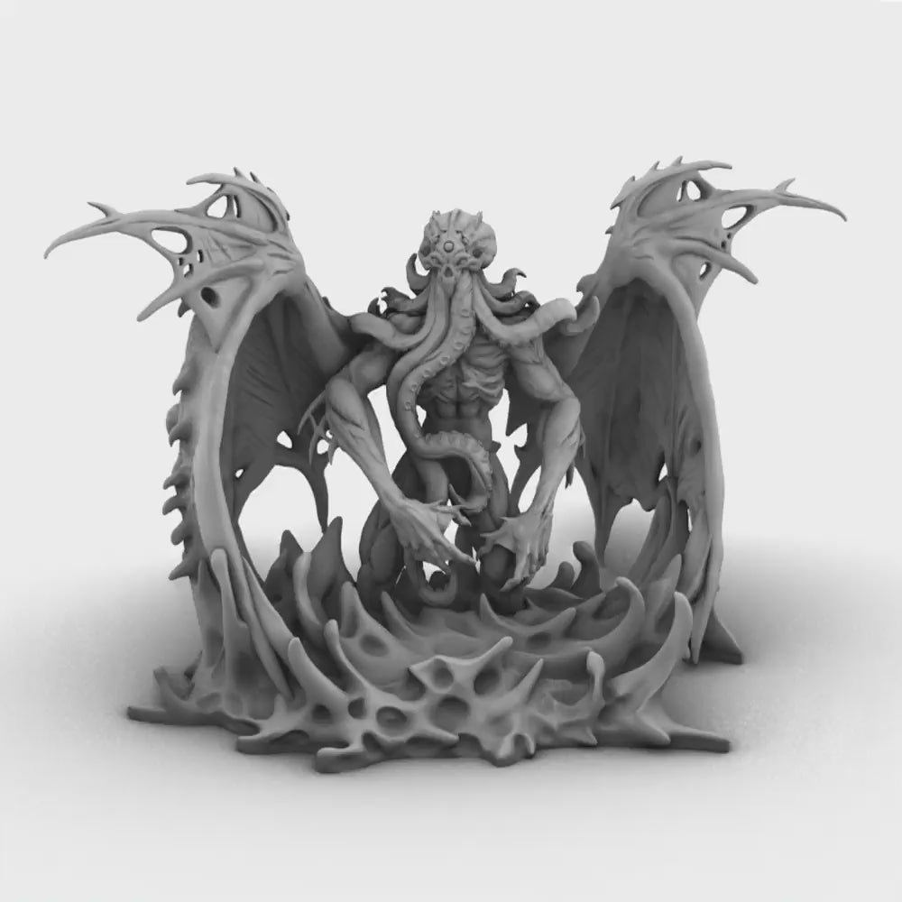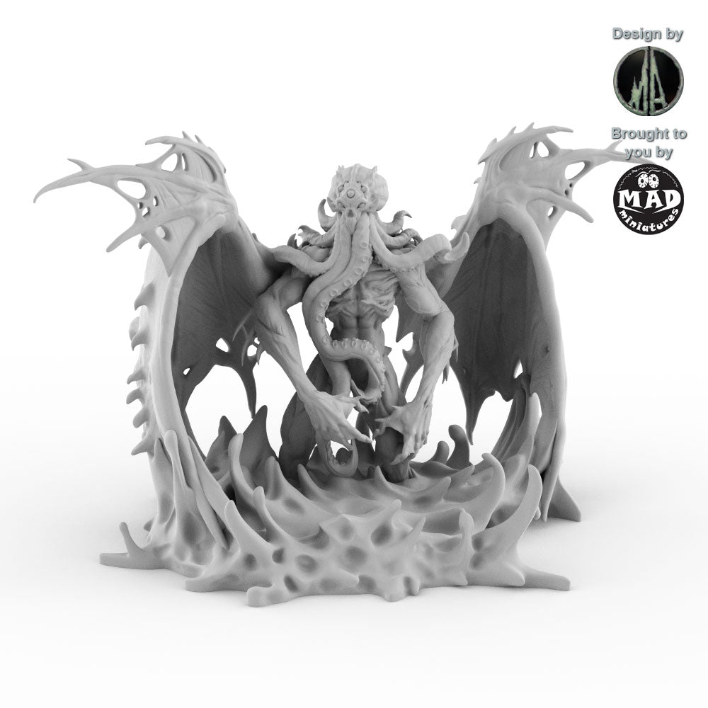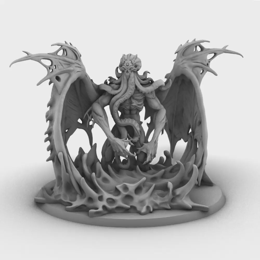 From its back unfurl massive, bat-like wings, their span creating rippling shadows through the murky waters. Its head is a writhing mass of octopus tentacles, each pulsing with eerie, bioluminescent light that casts an unsettling glow on the depths it patrols. The creature’s claws, massive and razor-edged, glint menacingly in the dim light, a testament to its role as a relentless enforcer of its cursed domain.