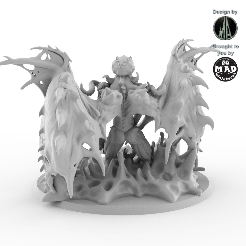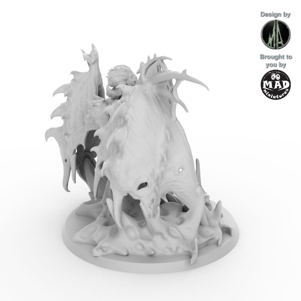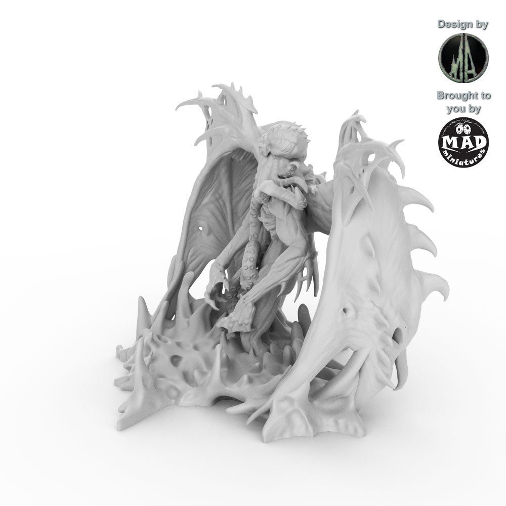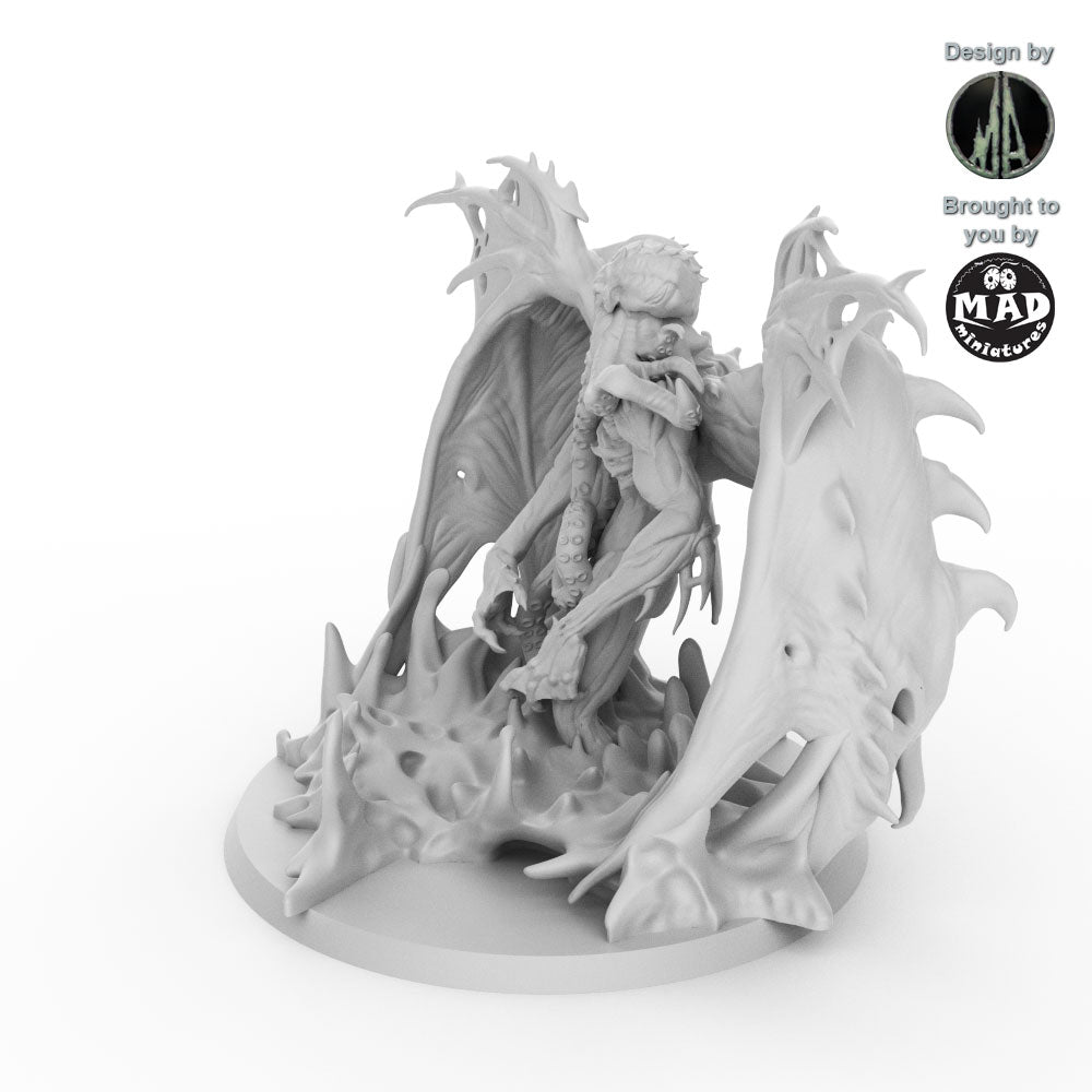 From its back unfurl massive, bat-like wings, their span creating rippling shadows through the murky waters. Its head is a writhing mass of octopus tentacles, each pulsing with eerie, bioluminescent light that casts an unsettling glow on the depths it patrols. The creature’s claws, massive and razor-edged, glint menacingly in the dim light, a testament to its role as a relentless enforcer of its cursed domain.