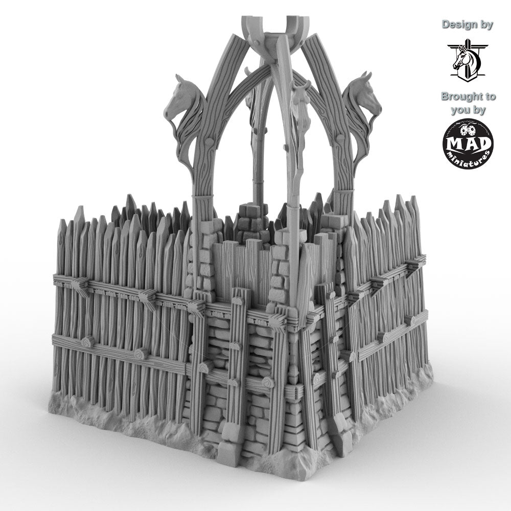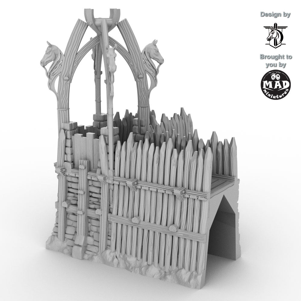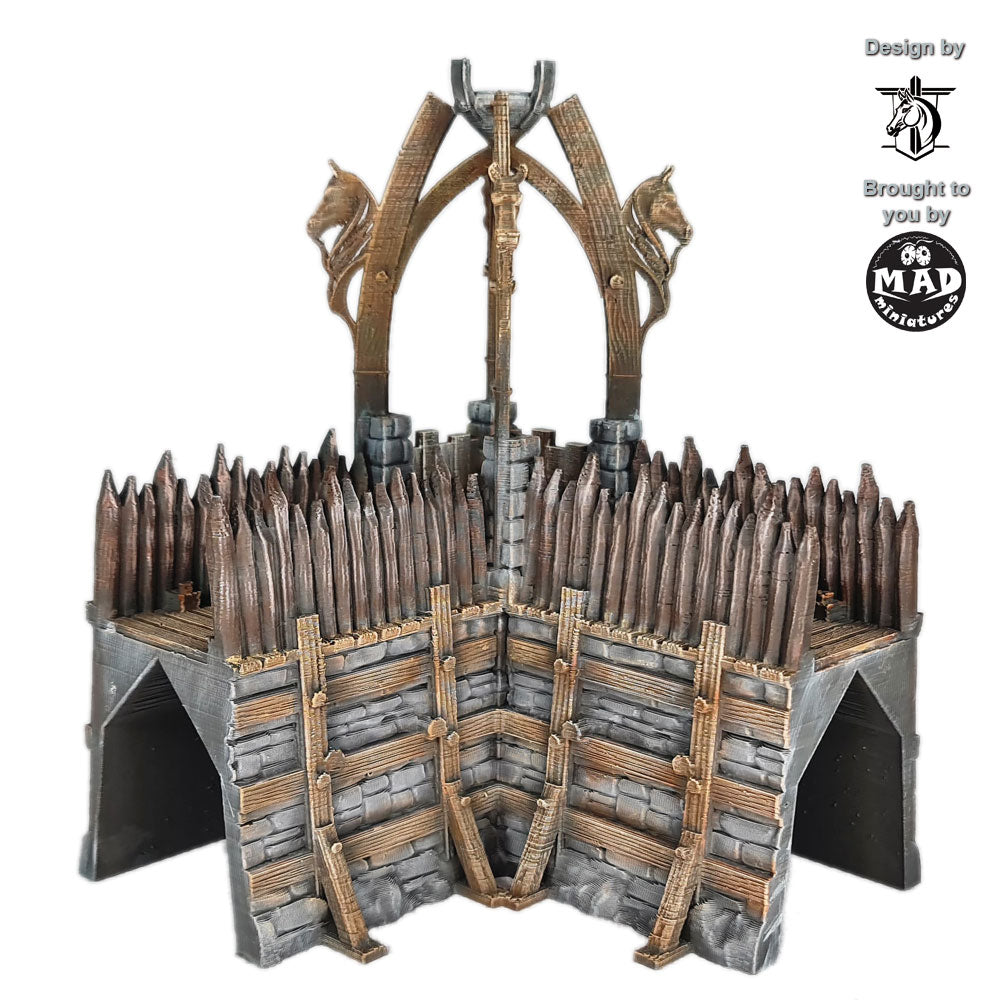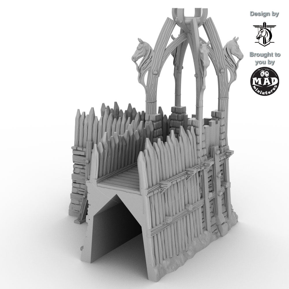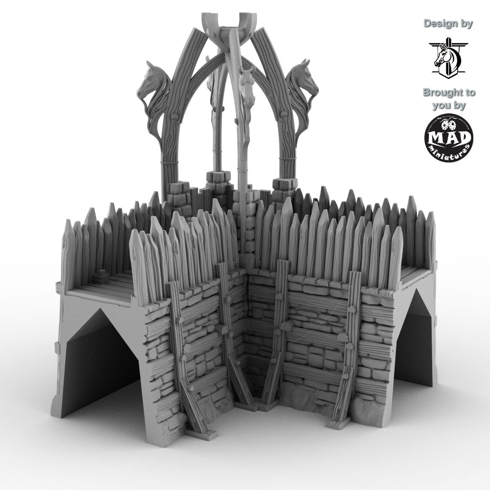 Expand your stronghold with this rugged corner section inspired by early-medieval Norse and horse-clan fortifications. With its carved horse-head motifs, heavy timber stakes, and reinforced stone base, this piece brings a distinctive cultural flair to your tabletop—perfect for frontier settlements, clan holds, and war-camp defences.