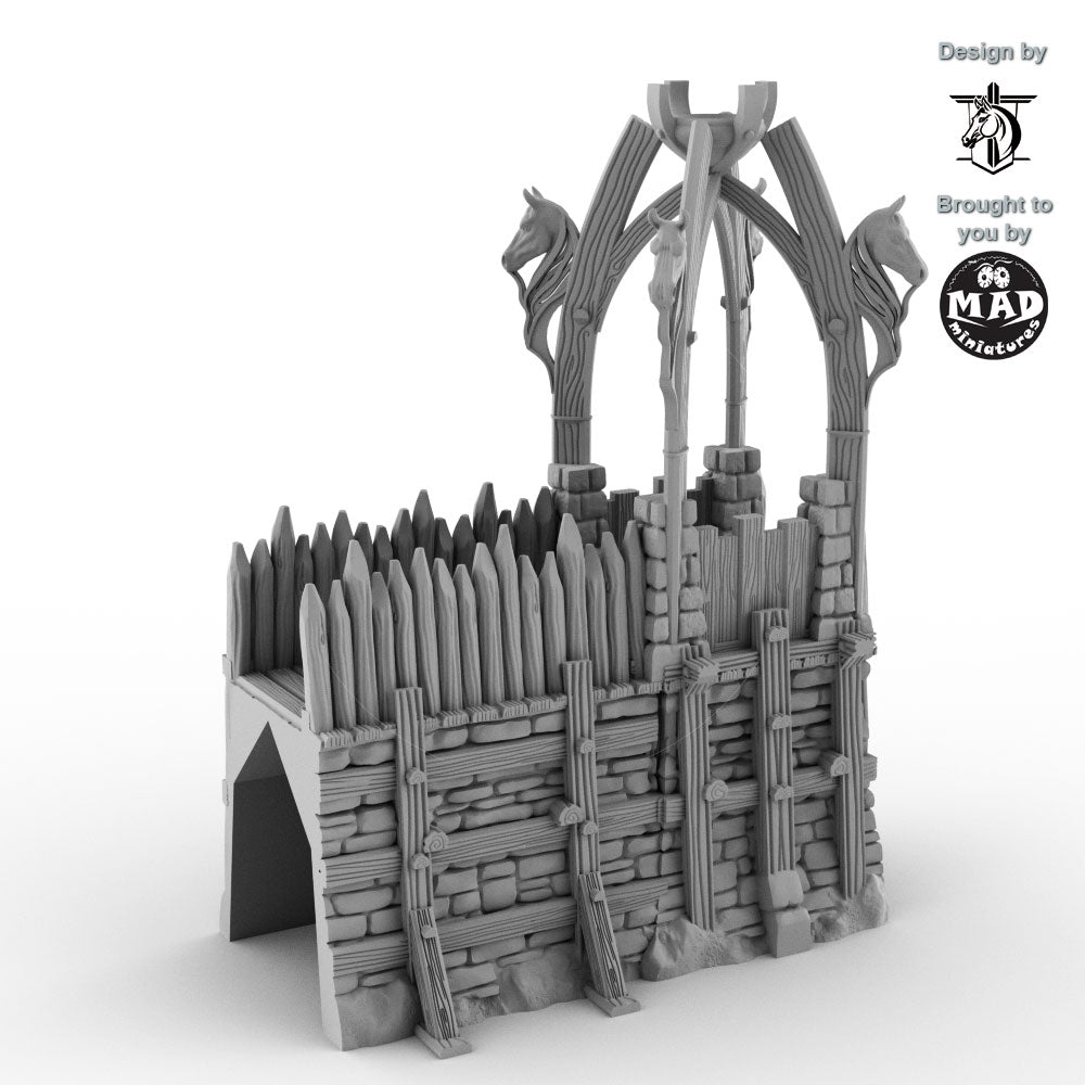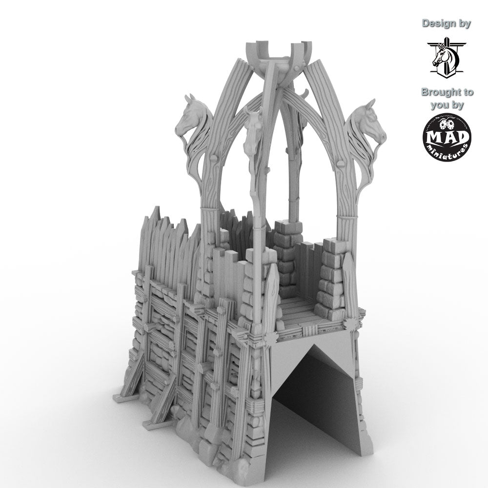 This left-side wall section features an integrated watchtower designed to slot seamlessly into the middle of your fortifications — not as an ending piece, but as a proud structural highlight within the wall line. The sculpted horse-head arches crown the tower with a noble, windswept aesthetic, while the timber palisade and reinforced stonework below form a sturdy defensive perimeter.