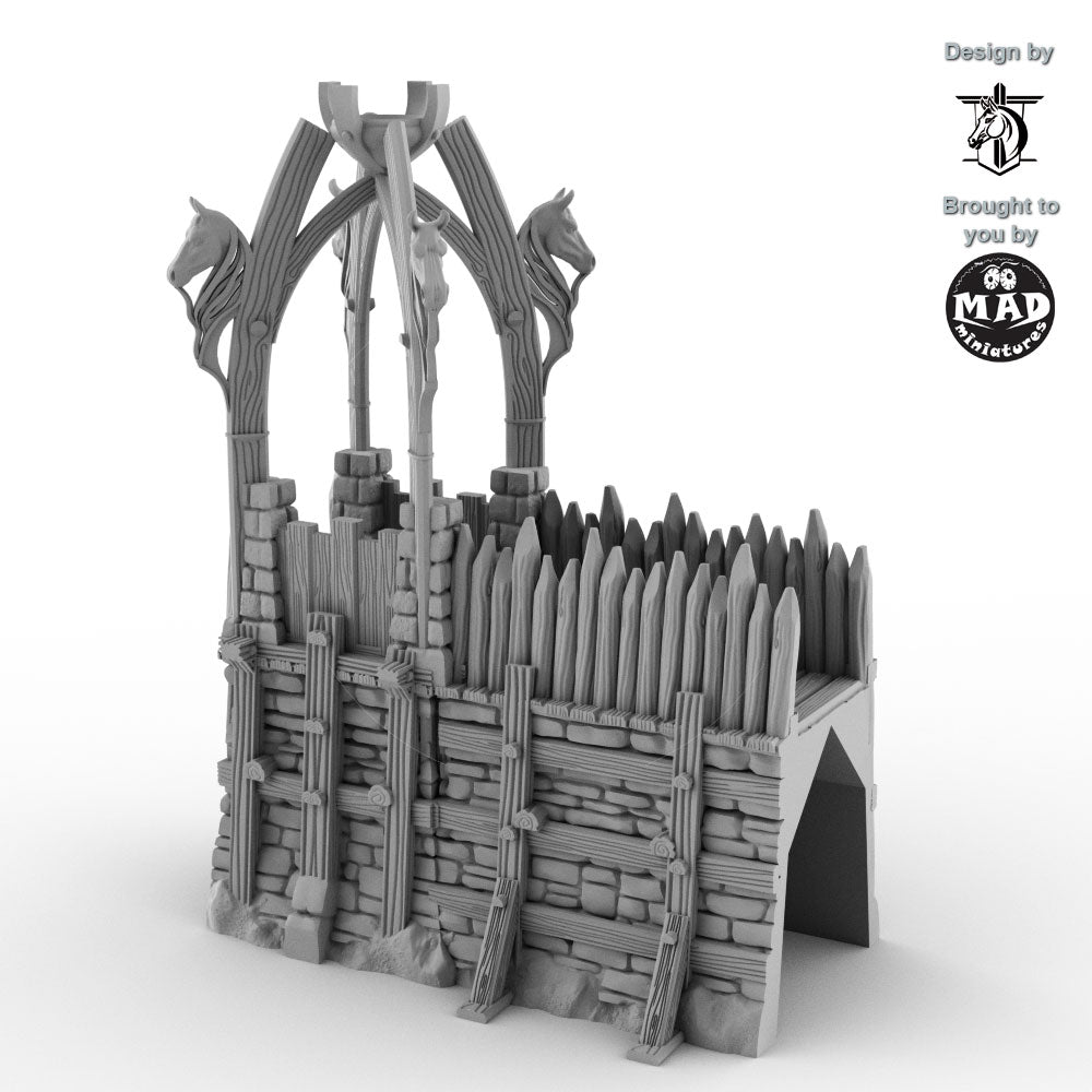 Rising above the timber palisades, this right-side wall section features an integrated watchtower — a fortified position designed to sit within the wall line rather than at its end. The carved horse-head arches give the structure a proud, almost ceremonial character, while beneath them, layered timber and stone reinforce the battlements.