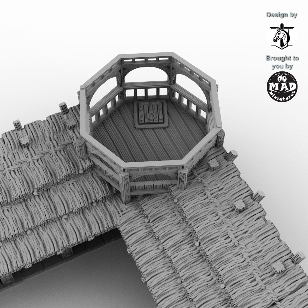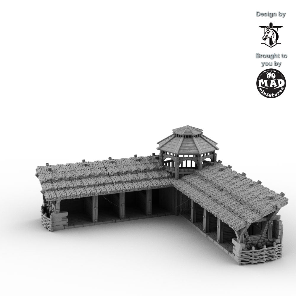 The thatched roofing can be removed for complete access to the interior. The open exterior bays allow easy placement of figures, while the central tower adds vertical gameplay options and makes the stable an impressive, multi-functional terrain piece.
