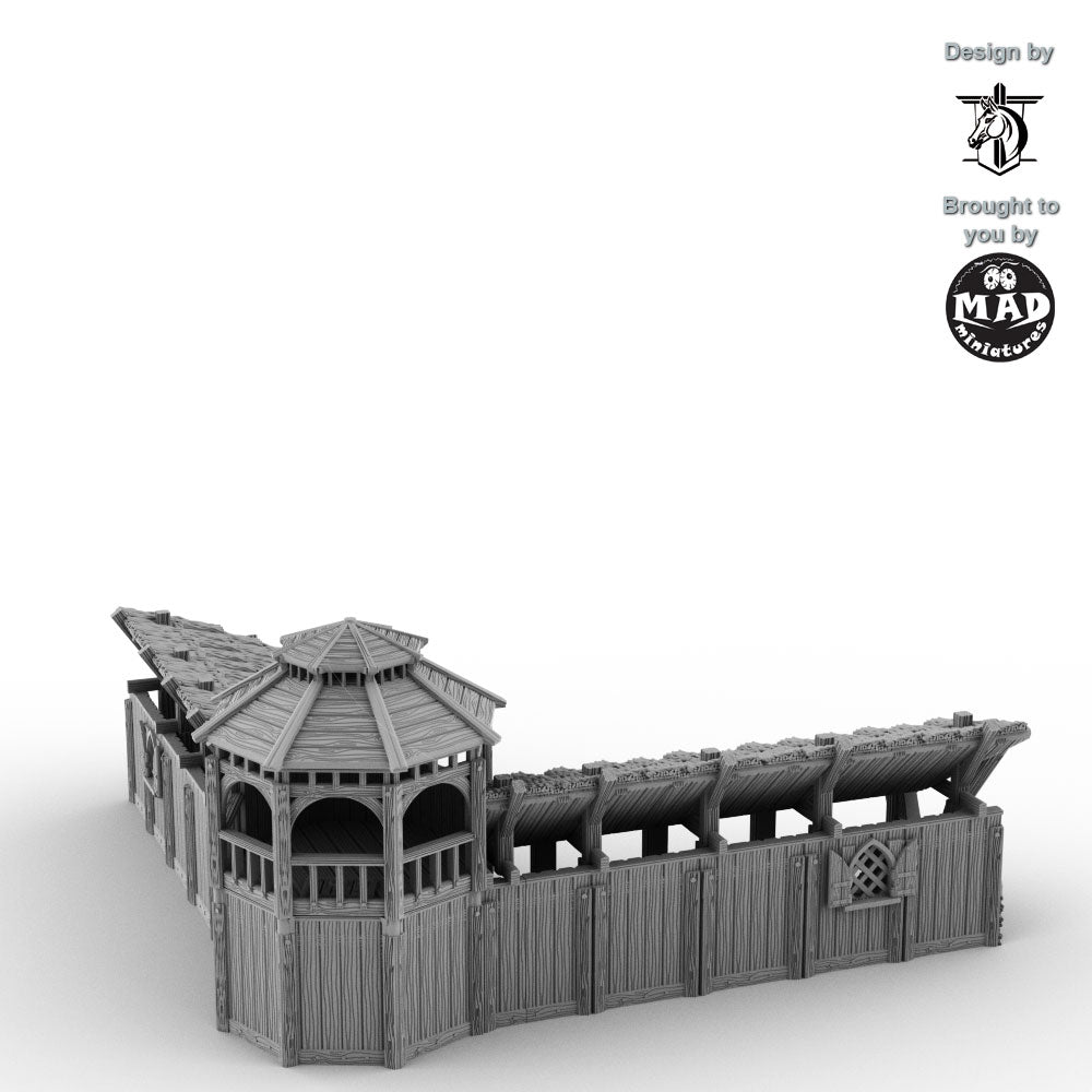 The Great Stable is a large corner-shaped structure featuring two long wings connected by an octagonal watch tower. Built in Horseheim’s signature timber-and-thatch style, it provides a realistic and immersive stable environment with individual stalls, wooden dividers, and fully textured floors.