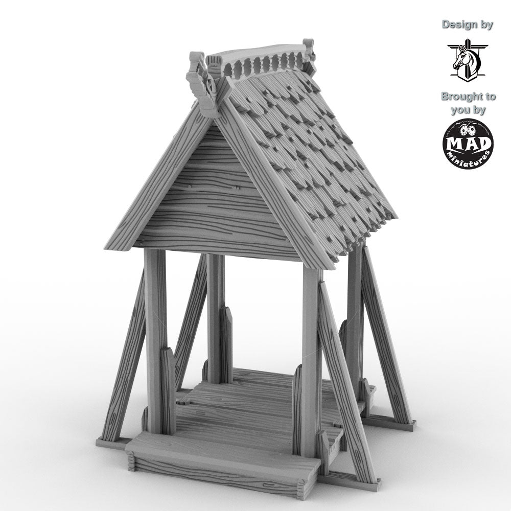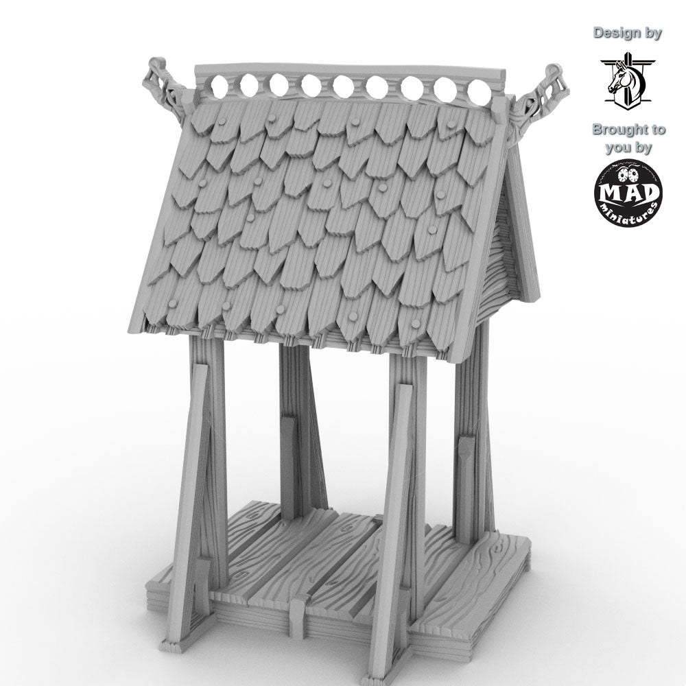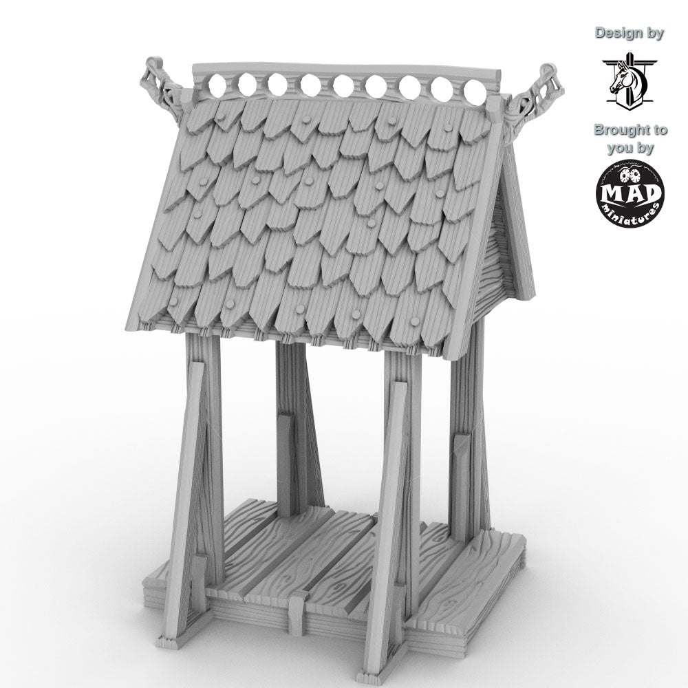 A beautifully crafted timber Lych Gate designed for the Horseheim fortifications and settlement range. Features include layered roof shingles, a raised wooden platform, angled supports, and carved end beams. Perfect as a thematic entry point or decorative structure in fantasy or historical tabletop settings.