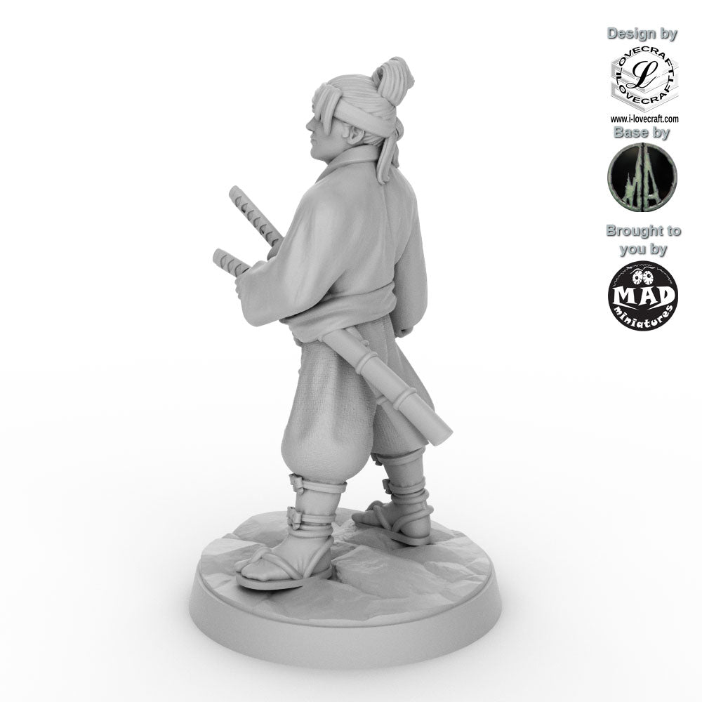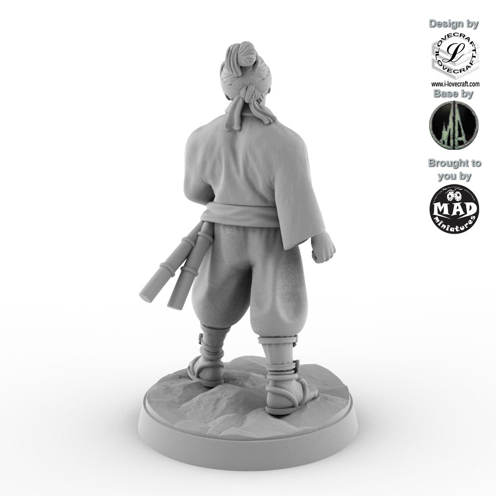 Miyamato Musashi was designed by Iain Lovecraft and made by Mad Miniatures. He comes unpainted and with a separate base as shown in the grey renders. The base was designed by Monolith Arts.