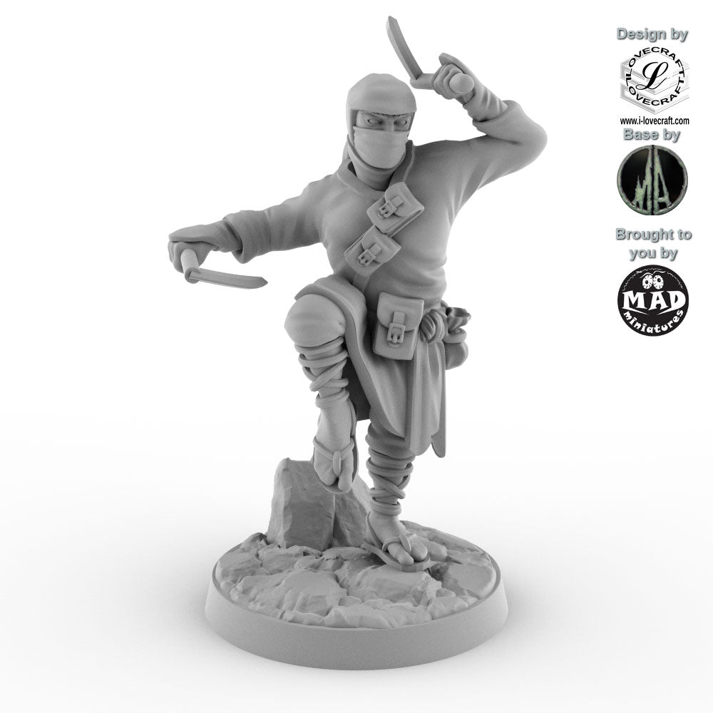 These Ninjas were designed by Iain Lovecraft and made by Mad Miniatures. They come unpainted and with a separate base as shown in the grey renders. The base was designed by Monolith Arts.