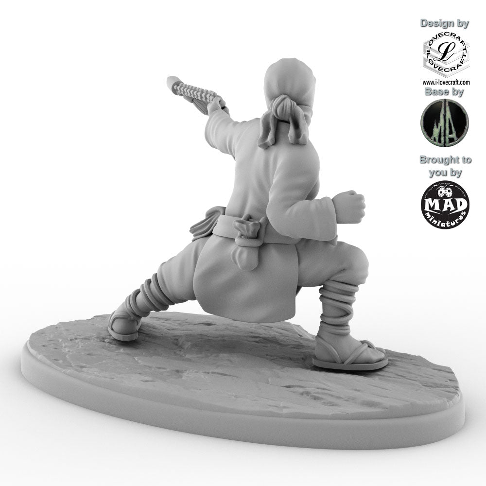 This Ninja was designed by Iain Lovecraft and made by Mad Miniatures. He comes unpainted and with a separate base as shown in the grey renders. The base was designed by Monolith Arts.