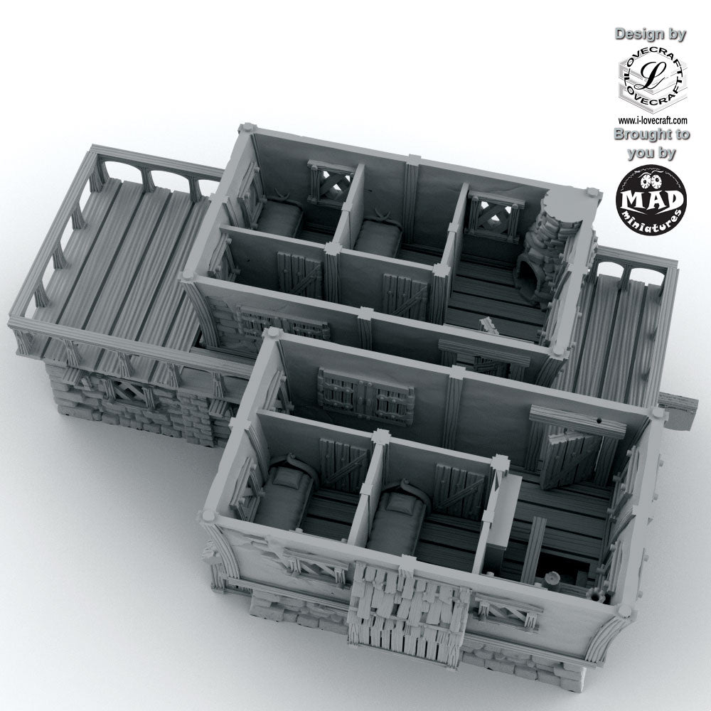 On the lower floor, adventurers will find a bustling tavern complete barrels of wine, and all the little details that bring roleplay to life. Place your tables and chairs here and your heroes can start an adventure from right here. Upstairs, the building splits into two guesthouses, each with two cosy bedrooms, giving plenty of space for adventurers to rest after a long day on the road. Two balconies overlook the streets below, perfect for shady dealings, dramatic entrances, or midnight escapes.