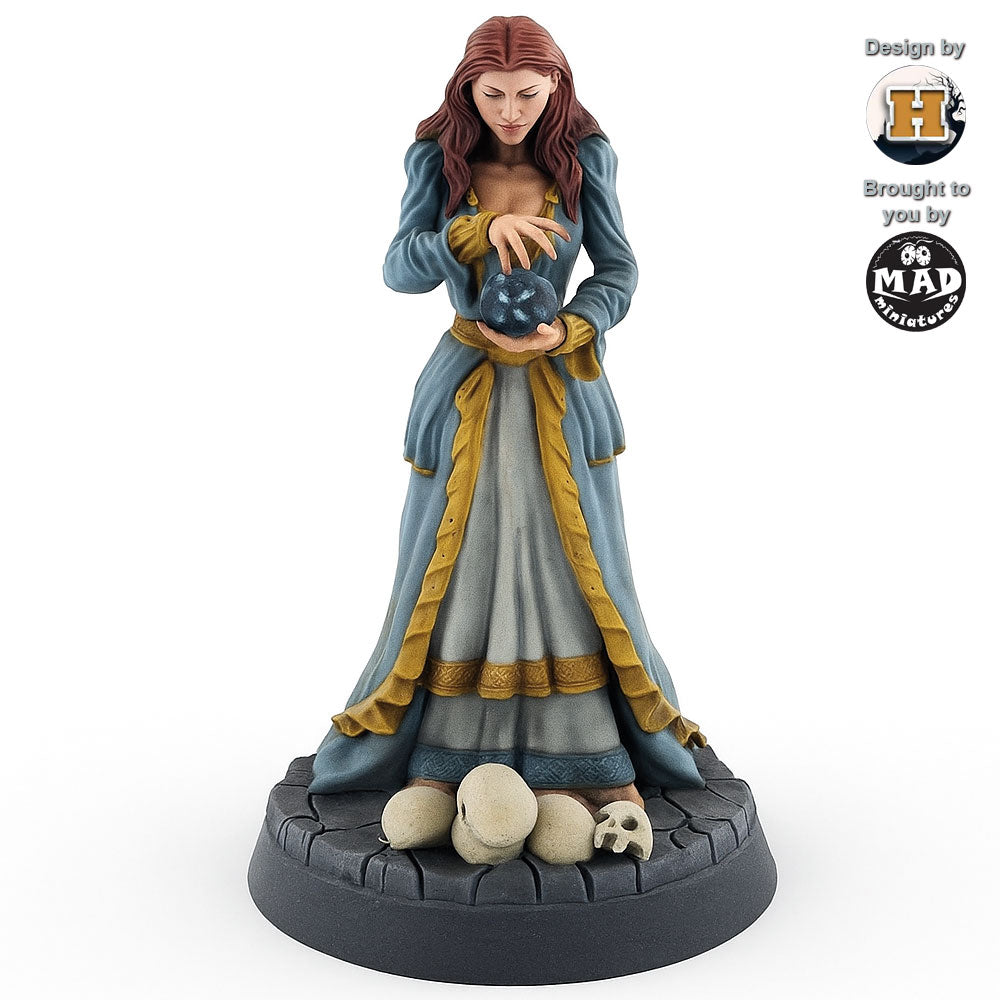 Regrid’s crystal ball rested lightly in her hand, glowing faintly as it whispered secrets of distant lands and unseen threats. She had no need for tomes or chants; her magic was raw and instinctive, forged not in the sanctuaries of scholars but in the crucible of survival. At her feet lay skulls, relics of those who underestimated her — a stark reminder that her services came at a price far greater than gold for those who crossed her.