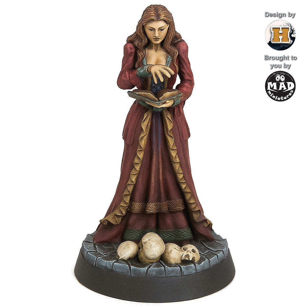 Regrid stands with quiet authority, her long dress shimmering in the light. In one hand, she holds an ancient book, its glowing pages alive with shifting words. Her other hand delicately turns a page as her eyes scan the forbidden knowledge within. At her feet lie skulls, silent witnesses to her power.