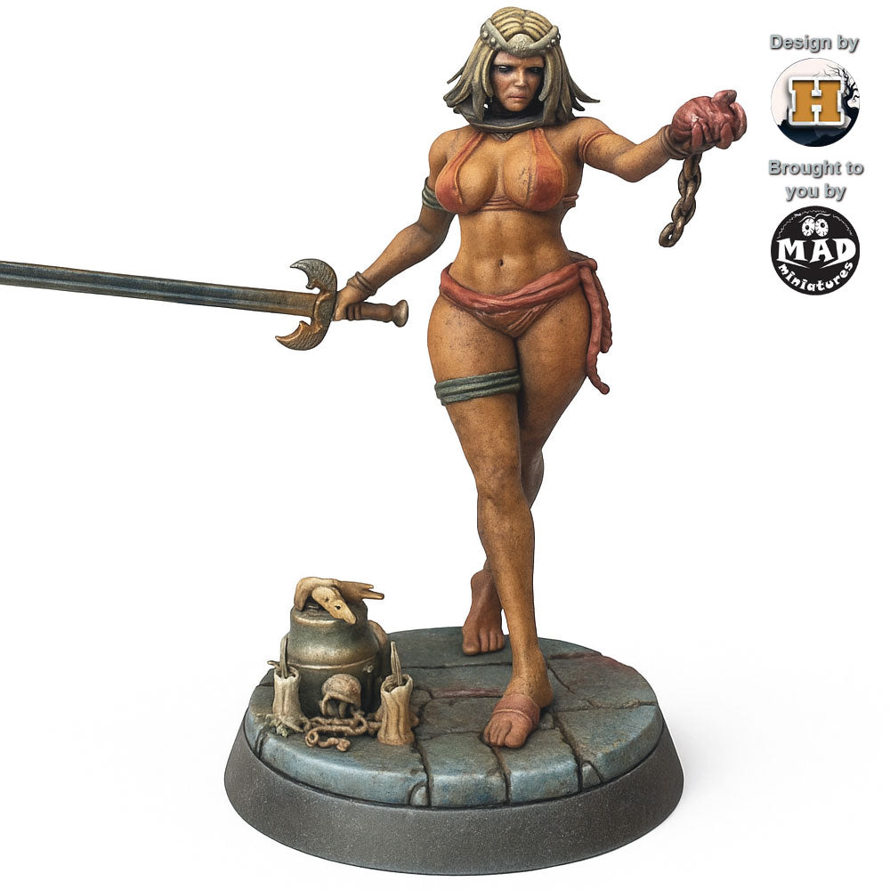 Clad in the remnants of her captivity, her diadem glimmers as a lone symbol of her royal lineage. In one hand, she wields a finely crafted sword, its blade as sharp as her resolve. In the other, she holds the literal heart of her captor—a chilling reminder of her harrowing escape and a warning to those who dare stand in her way.