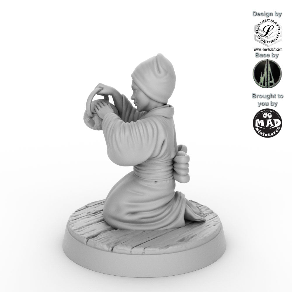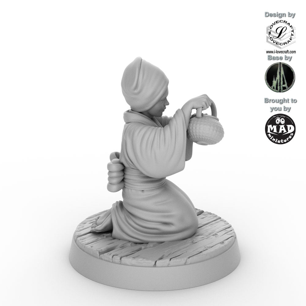 The Tea Lady was designed by Iain Lovecraft and made by Mad Miniatures. She comes unpainted and with a separate base as shown in the grey renders. The base was designed by Monolith Arts.