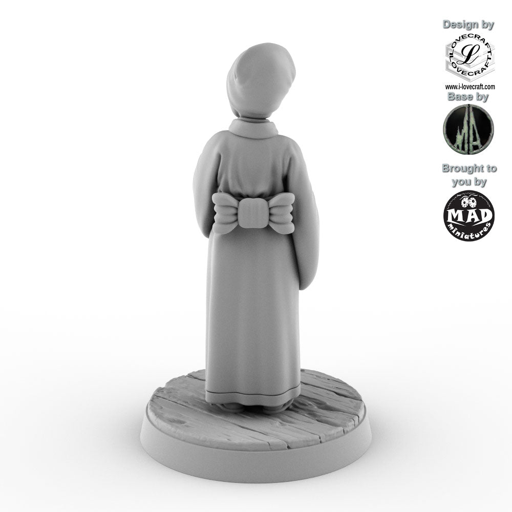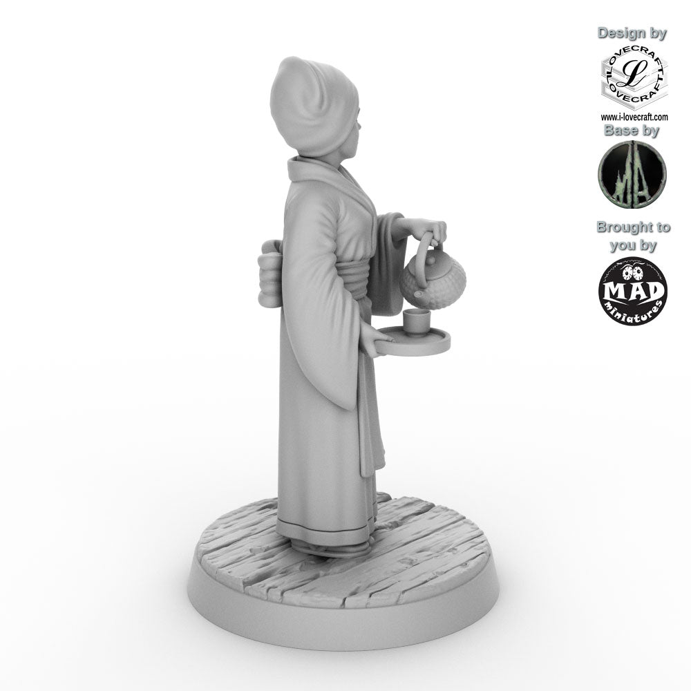 The Tea Vendor was designed by Iain Lovecraft and made by Mad Miniatures. She comes unpainted and with a separate base as shown in the grey renders. The base was designed by Monolith Arts.