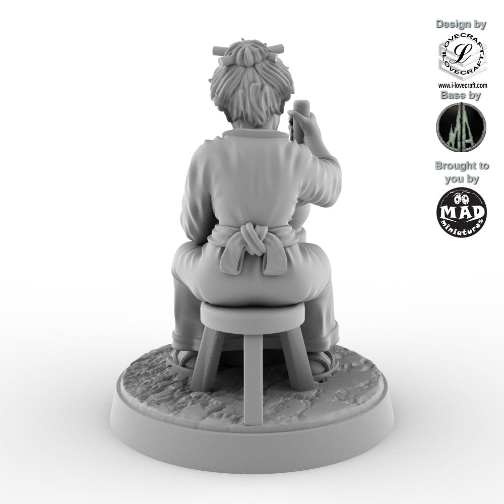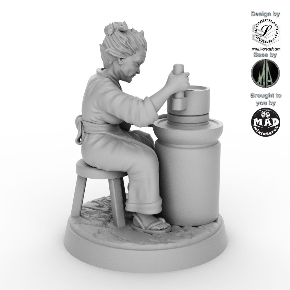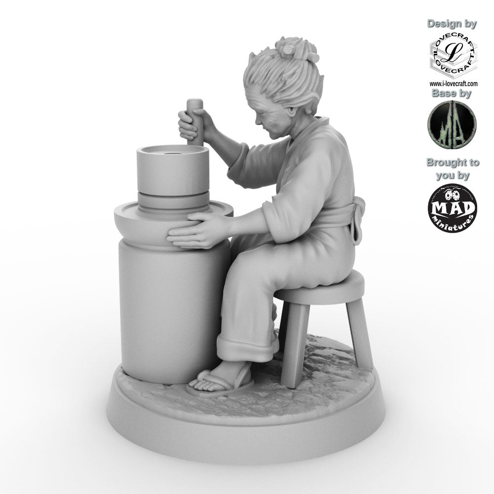 Patient and steady, the old miller turns the stone with practiced ease, her hands guiding the rhythm that feeds her village. Every grain she grinds carries the weight of experience and tradition - a humble, vital role in the flow of daily life in Nippon. A perfect addition for any tabletop scene of craftsmanship and community.