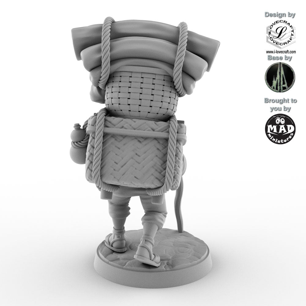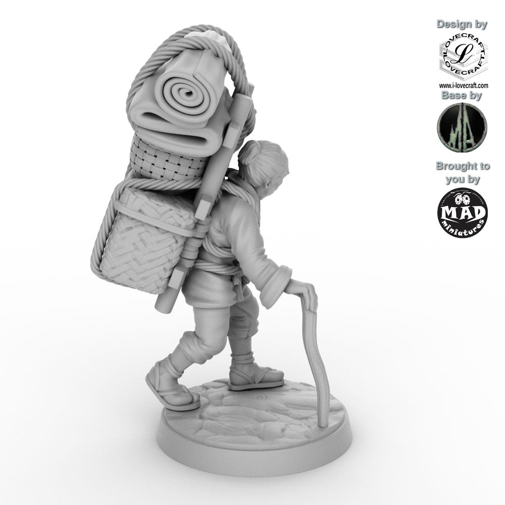 Bent beneath the weight of his load, the Porter carries goods and supplies across the rugged paths of Nippon. His face shows both fatigue and determination, a symbol of endurance and humble strength. The intricate details - from the rolled mats to the woven basket and walking stick - tell a story of travel, toil, and resilience. A perfect figure to bring life and realism to your village or trade route scenes.
