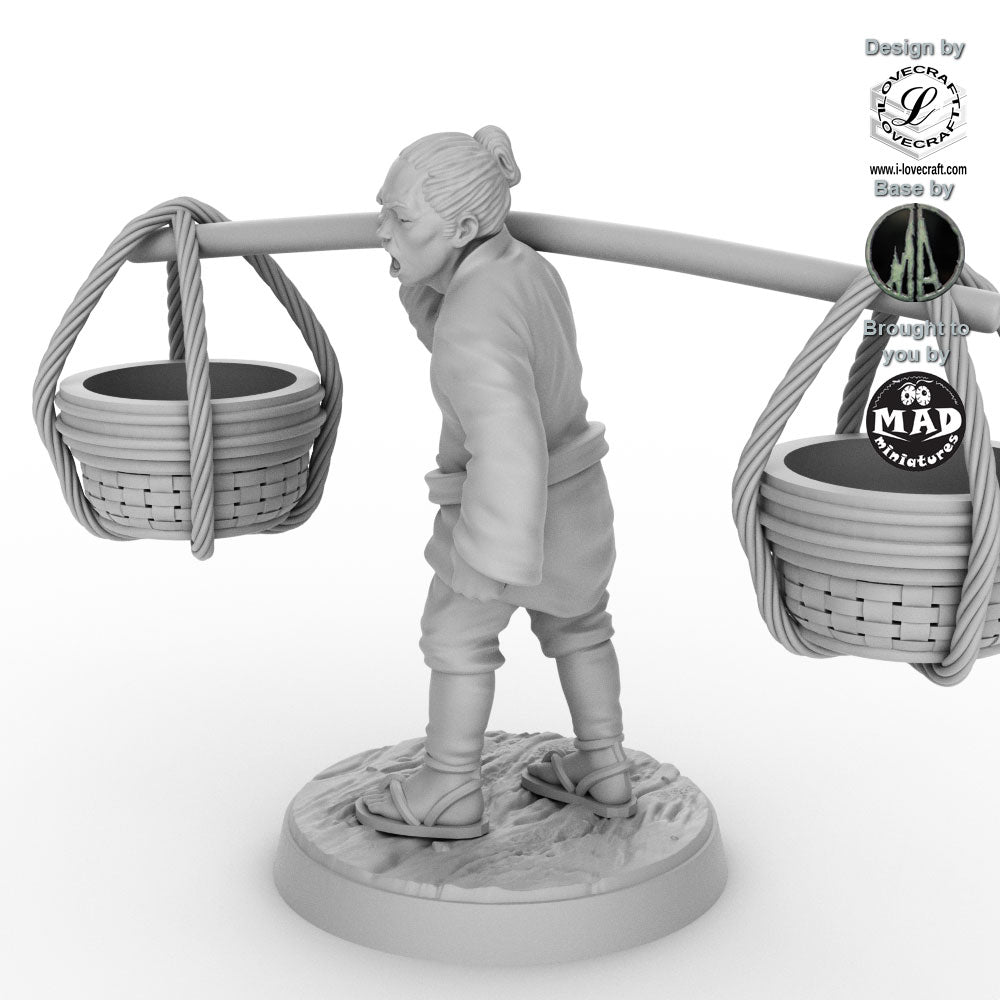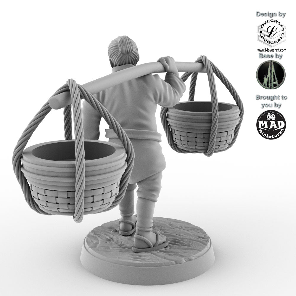Carrying the weight of his trade with strength and skill, the Water Vendor is a familiar sight in the villages of Nippon. Balancing two heavy baskets suspended from a sturdy pole, he calls out to announce his arrival, embodying the rhythm of everyday life. A beautifully detailed miniature that captures both motion and effort, perfect for bringing authenticity and atmosphere to your tabletop scenes.