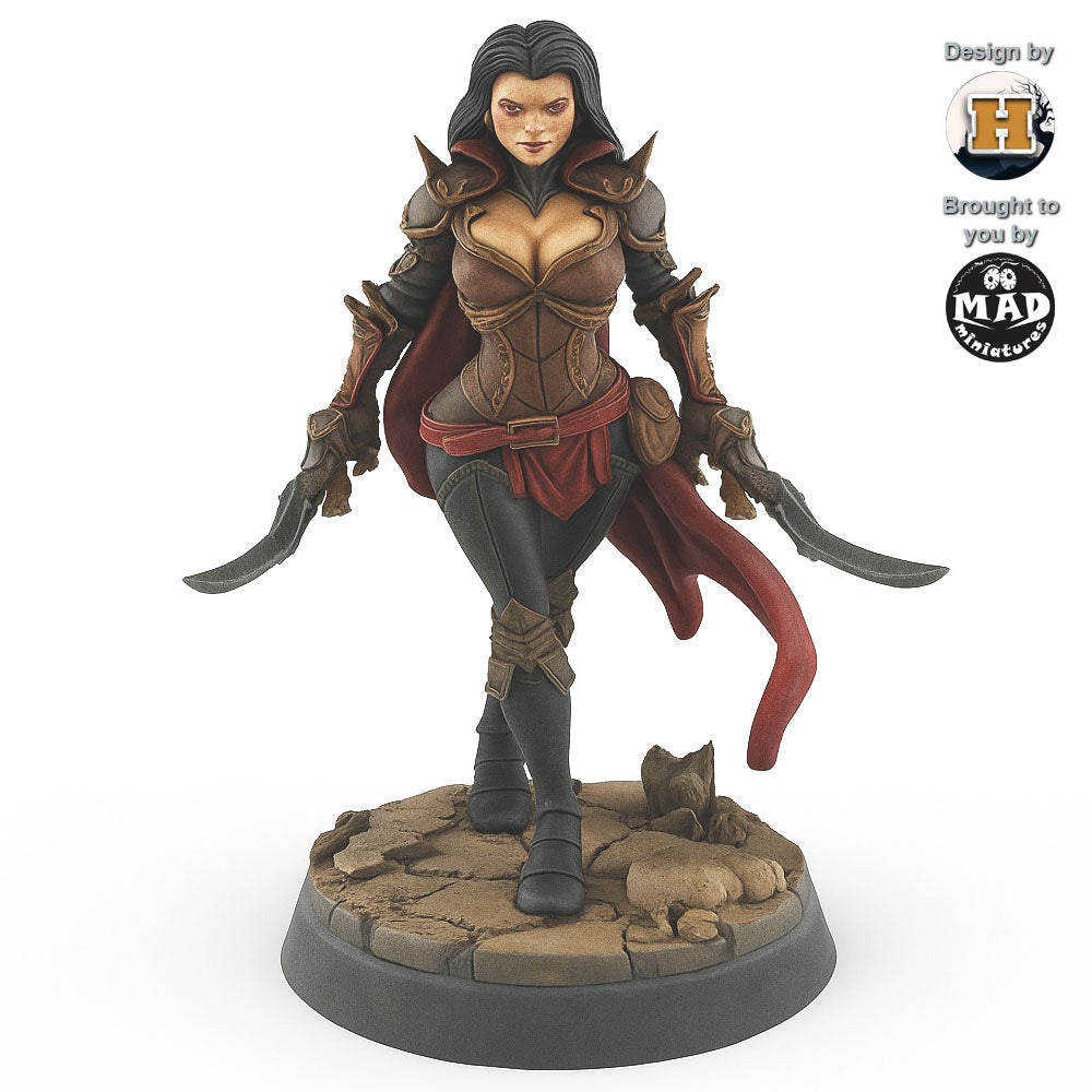 Vesanna strikes a commanding figure, her leather armor accented with spiked metal plates that glint ominously in the light. A dark cape flows behind her, adding to her air of deadly elegance. In her hands, she wields twin swords, each blade crafted specifically for her—a perfect extension of her speed and precision.