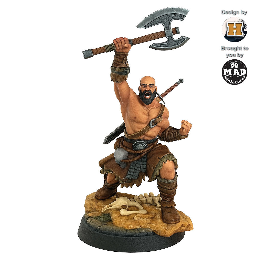 Virtix, now battle-hardened and bald, strides into combat with even greater ferocity, his twin-bladed axe in hand and a sword slung across his back for swift versatility. The absence of his long hair reveals countless scars etched across his scalp, each a testament to victories hard-won. With the same fur-draped skirt and boots grounding his imposing presence, Virtix continues to uphold his clan's honor, proving that no enemy can withstand his relentless strength and cunning.